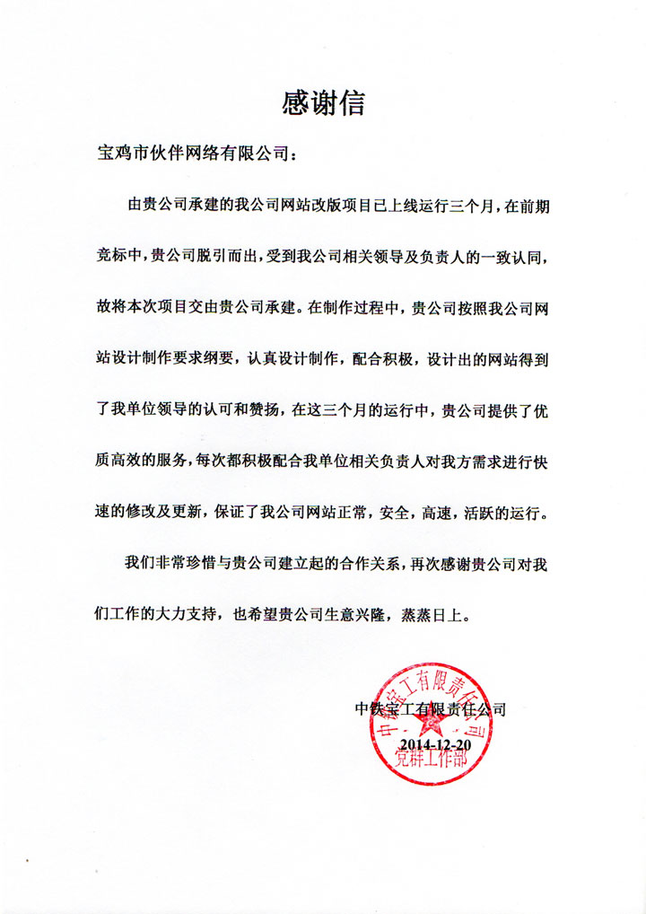 您現(xiàn)在的位置: 寶雞網(wǎng)絡(luò)公司 > 新聞動(dòng)態(tài) > 公司動(dòng)態(tài) > 我公司收到中鐵寶工感謝信